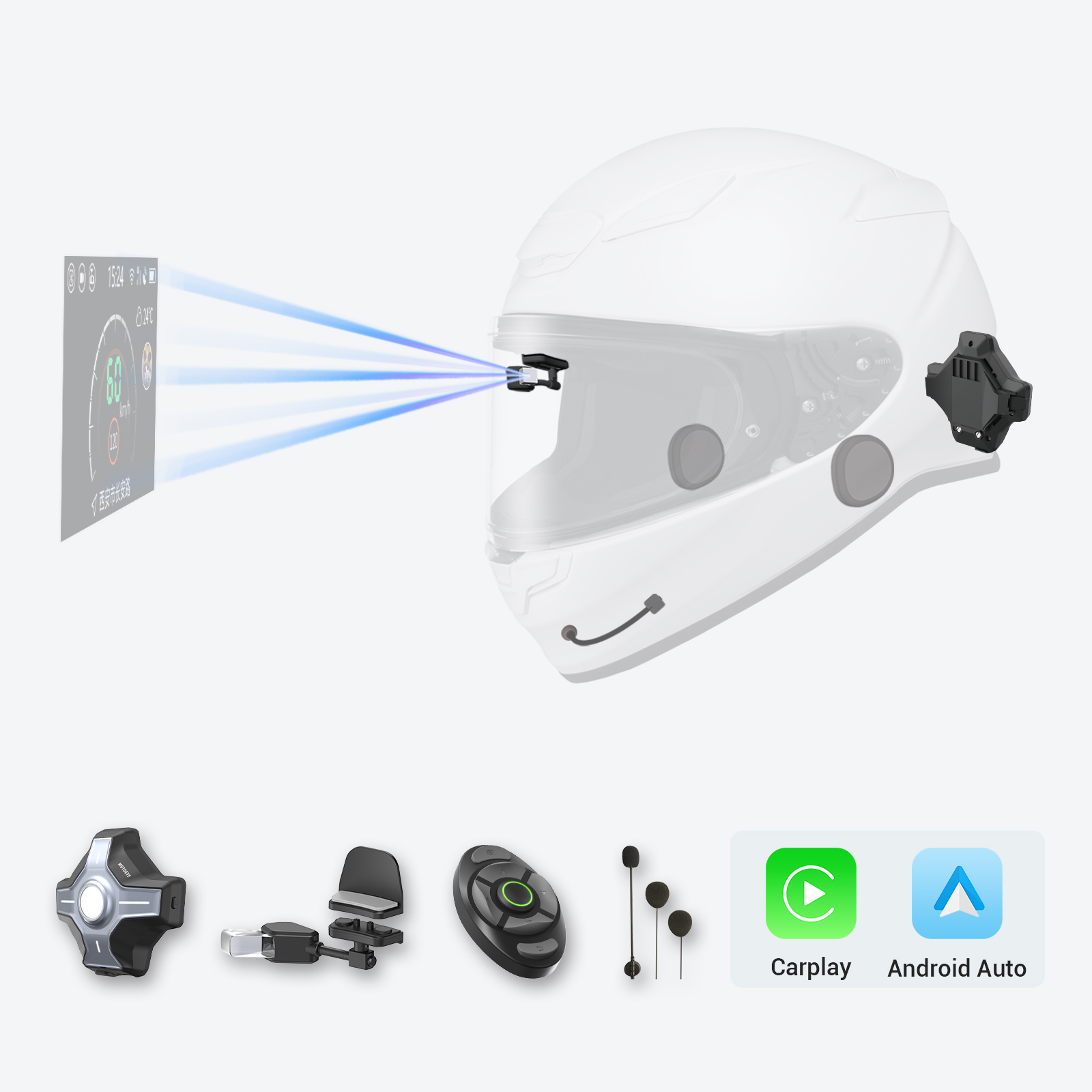MotoEye HUD uses AR imaging principles, that can display the information needed for riding at the upper position in front of the human eye. AR display of MotoEye HUD features high-definition with 10000:1, highlights and adjustable brightness.