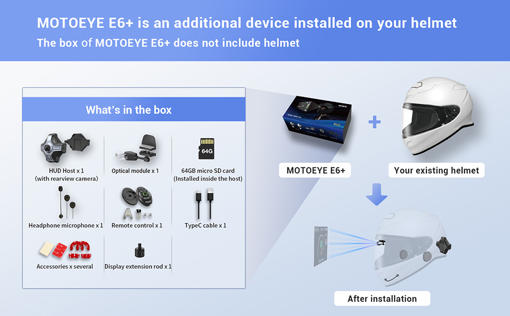 MotoEye HUD is designed as an external accessory, which allows you to freely use your own helmets.